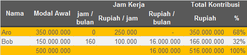 Sesuai kesepakatan awal satu jam kerja Aro dihargai Rp 250.000 per jam (karena lebih berpengalaman di bidang properti), sedangkan satu jam kerja Bob dihargai Rp 100.000 per jam (karena Bob tidak memiliki pengalaman dibidang property sebelumnya). Kemudian di awal usaha Bob menyertakan modal sebesar Rp 150.000.000 dan Aro sebesar Rp 350.000.000.