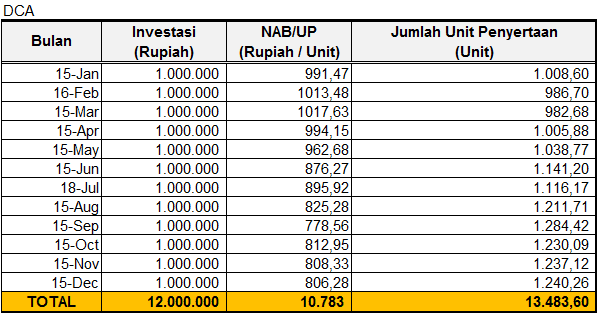 Pak Ronald memiliki uang sebesar Rp 1.000.000 yang akan diinvestasikan setiap tanggal 15. Beliau akan berinvestasi pada produk reksadana Mega Asset Maxima. Berikut ini tabel harga NAB/UP per bulan dan jumlah unit penyertaan yang dimiliki.