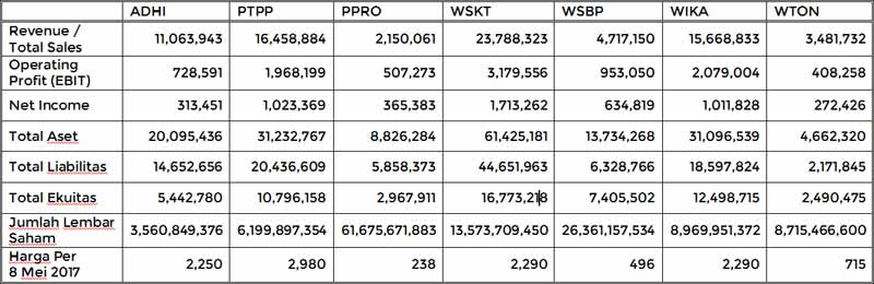 Berikut adalah perbandingan laporan keuangan tahun 2016 yang dirilis oleh keempat emiten grup karya beserta anak-anak usahanya yang listing di bursa.